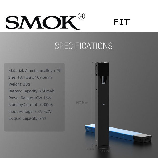 SmokTech has set the bar for affordability and discreetness, and the Fit Kit Ultra Portable all-in-one Pod System has set the bar higher. Featuring a visually striking rectangular body, with a 250mAh internal battery and a refillable 2mL pod cartridges. Crafted from high quality aluminum alloy and durable poly-carbonate.